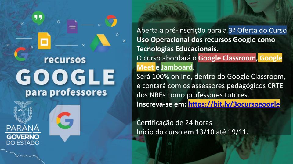 ? Inscreva-se em: https://bit.ly/3ocursogoogle (para acessar o formulário de inscrição, é necessário estar logado com a sua conta @escola).