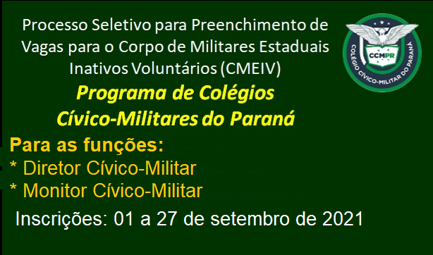 Policiais militares da reserva remunerada podem consultar o edital do processo seletivo para o preenchimento de vagas destinadas ao Corpo de Militares Estaduais Inativos Voluntários (CMEIV) para o Programa de Colégios Cívico-Militares do Governo do Estado. As vagas são para as funções de Diretor Cívico-Militar e Monitor Cívico-Militar.